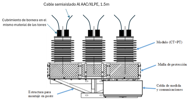 Uno de los módulos debe poseer un devanado adicional en el secundario del t.t., para alimentar los equipos de comunicación, 120/208 V y 60 VA. Se debe incluir protección termomagnética (en celda) de 1 x 2 A y DPS. Se debe garantizar que este devanado no afecte la calidad de la medida. También se debe determinar el tipo de interruptor a utilizar (curva de disparo) y tipo de DPS que aísle la falla y proteja al módulo del que se está alimentando.
