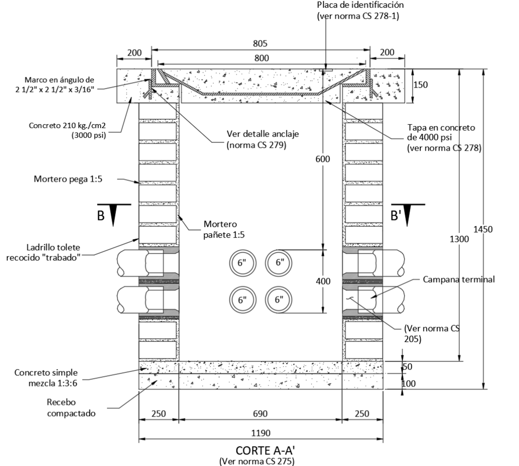 CS275-1 Caja de inspección sencilla para canalización de M.T. y B.T. Corte A – A` y marco
