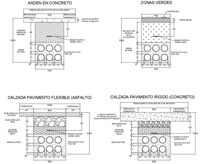- Para el caso de la calzada en concreto el esquema propuesto es para la malla vial local. Sobre la malla vial arterial e intermedia, el espesor de la placa de concreto debe ser mínimo igual al existente en la respectiva intervención.