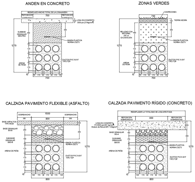 - Para el caso de la calzada en concreto el esquema propuesto es para la malla vial local. sobre la malla vial arterial e intermedia en el Distrito, el espesor de la placa de concreto debe ser mínimo igual al existente en la respectiva intervención. Al igual, la demolición y reposición será de la totalidad de la loza afectada. Para los proyectos fuera del ámbito del Distrito de Bogotá, se podrá analizar la reposición de la mitad de la loza si la afectación o canalización establecida en el diseño solo afecta este porcentaje. Esta última deberá definirse con base en las condiciones técnicas específicas de cada proyecto y sustentarse mediante el respectivo diseño.