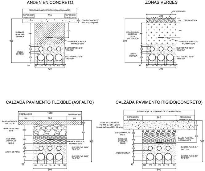 - Para el caso de la calzada en concreto el esquema propuesto es para la malla vial local. sobre la malla vial arterial e intermedia en el Distrito, el espesor de la placa de concreto debe ser mínimo igual al existente en la respectiva intervención. Al igual, la demolición y reposición será de la totalidad de la loza afectada. Para los proyectos fuera del ámbito del Distrito de Bogotá, se podrá analizar la reposición de la mitad de la loza si la afectación o canalización establecida en el diseño solo afecta este porcentaje. Esta última deberá definirse con base en las condiciones técnicas específicas de cada proyecto y sustentarse mediante el respectivo diseño.