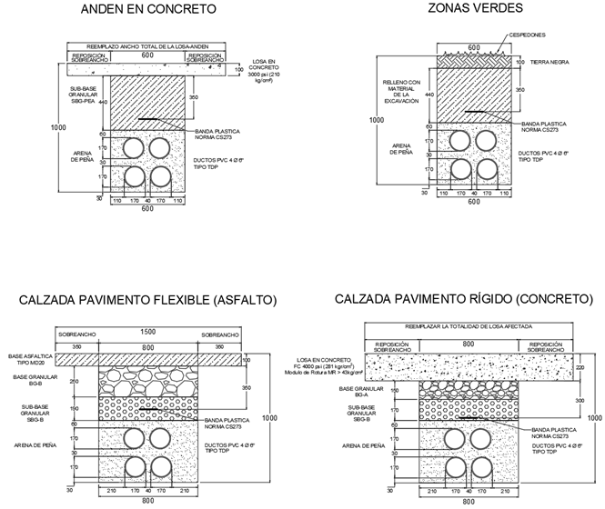 - Para el caso de la calzada en concreto el esquema propuesto es para la malla vial local. Sobre la malla vial arterial e intermedia, el espesor de la placa de concreto debe ser mínimo igual al existente en la respectiva intervención.