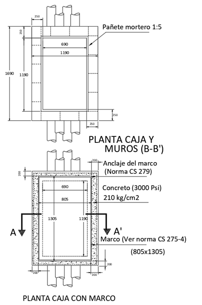 - En la ruta determinada del banco de ductos 6∅6", se permitirá construir caja de inspección sencilla CS275 en sentido transversal; para derivaciones de acometidas de BT y AP y como cajas de paso. En caso de derivaciones futuras por expansión de la red de MT se deben convertir a cajas de inspección dobles CS276.