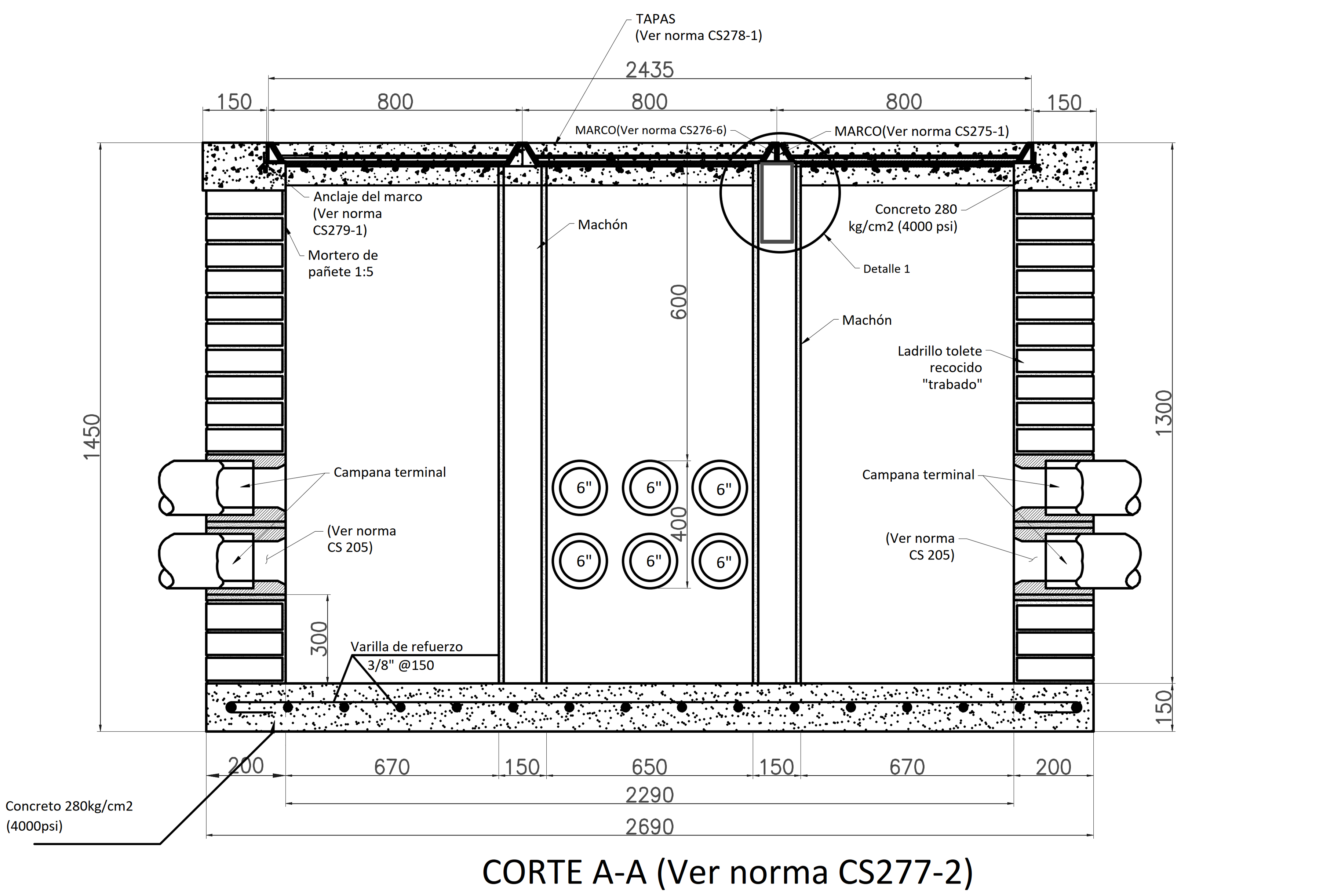 CS277-3 Caja de inspección triple para canalización de M.T. corte A - A' en calzada