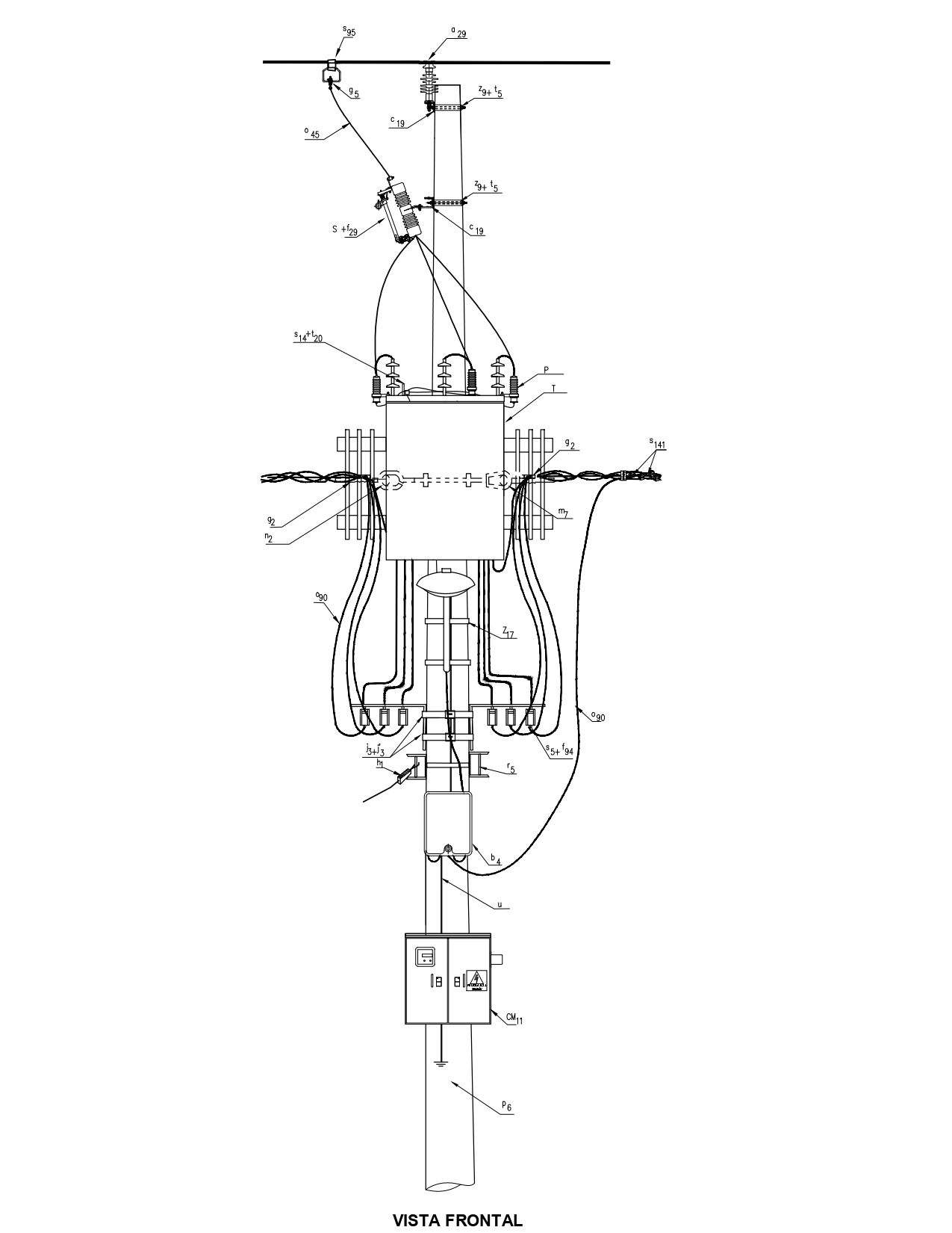 CTU502-4 Montaje en poste de transformador trifásico. Circuito en bandera con bujes de baja tensión superiores.