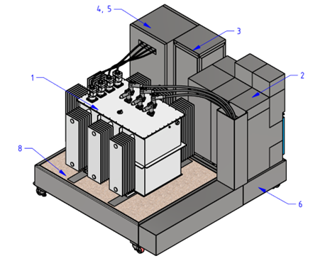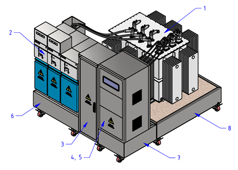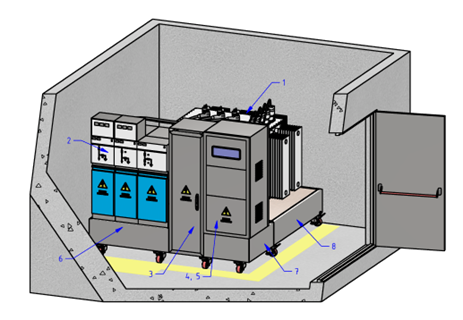 - Bastidor. Es un bastidor metálico modular para alojar de manera separada el grupo de celdas de Media tensión, tablero baja tensión y transformador con tanque de aceite de hasta 1000 kVA.