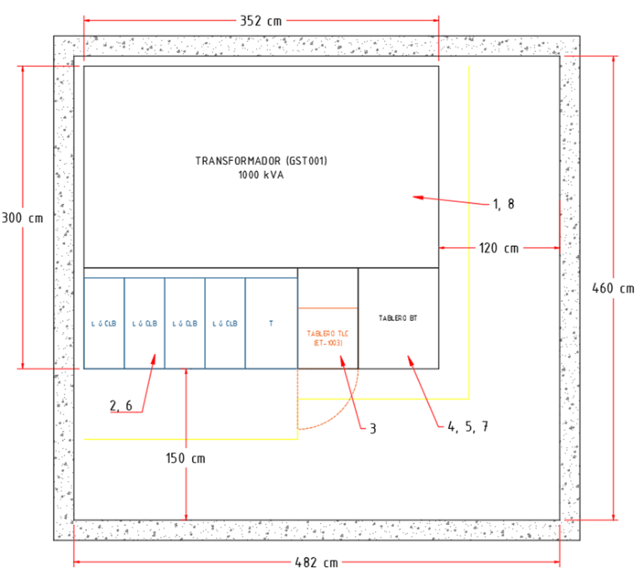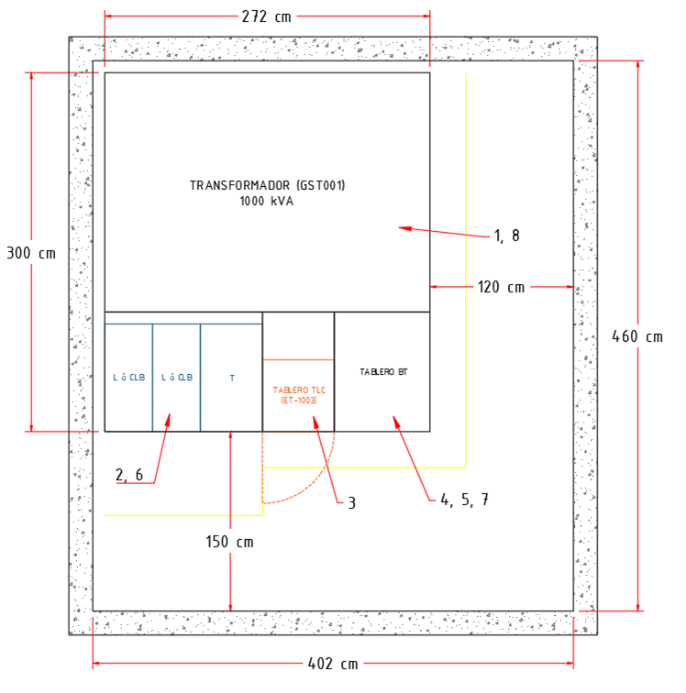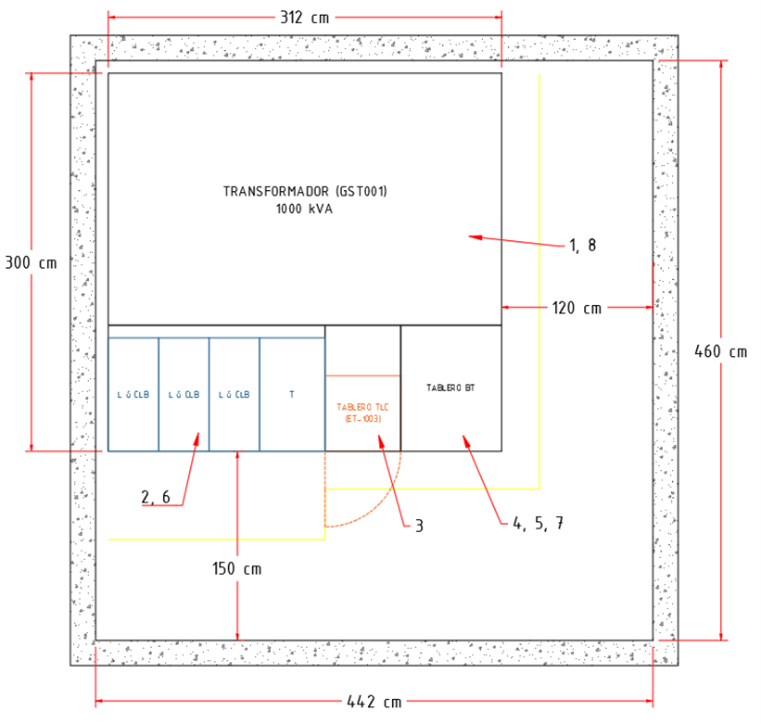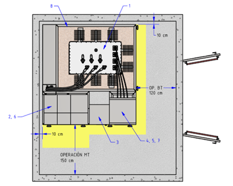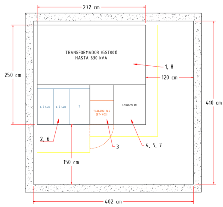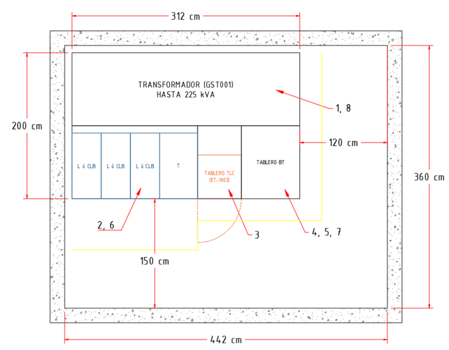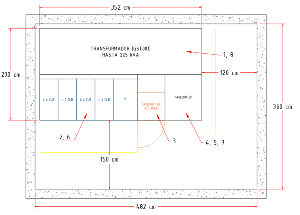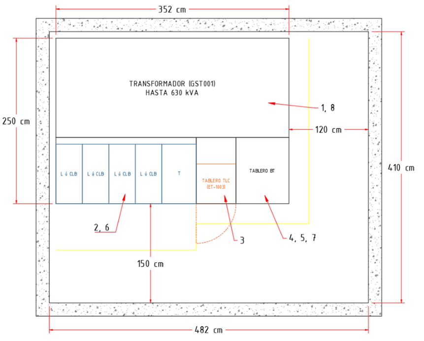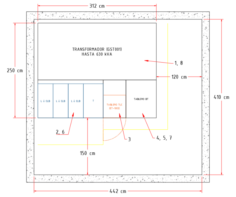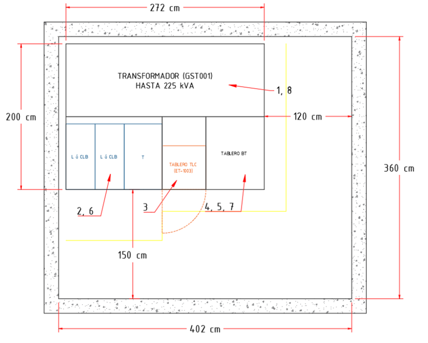 - Las ubicaciones de los equipos deben mantenerse como se presenta en el esquema, celdas MT costado izquierda, tableros BT costado derecha y transformador al respaldo; el tablero de TLC se recomienda su ubicación entre celdas MT y tablero BT.